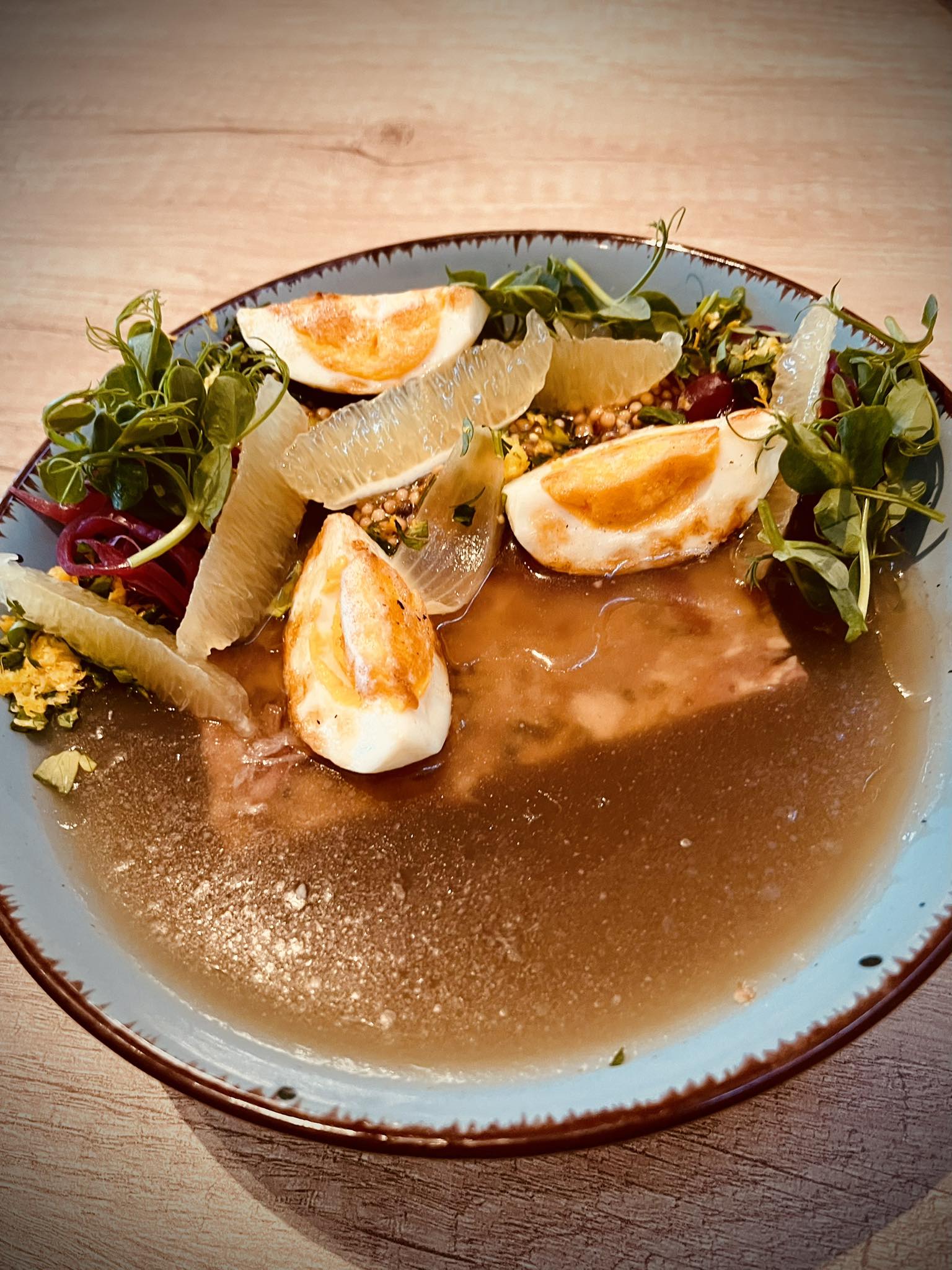 Egy hétfő délután keresgéltünk éttermet Nagymaros és Zebegény közelében. A legtöbb környékbeli étterem zárva tart ezen a napon, de egy kedves helyi házaspár tanácsolta az O'mamit, ami nyitva tart hétfőnként is. A hely melegséget árasztó és nagyon modern enteriőrje első pillanattól megnyerő volt, ugyanúgy, ahogy a fogadtatás is! Figyelmes, kedves, profi személyzet, különleges és változatos étlap, kiegészülve egy remek borlappal, borvidékeink legjobb boraival. Mindketten a chef ajánlatát választottuk! Én személy szerint egy újragondolt hallevest, garnélával és más különlegeségekkel.....hát azóta is azon gondolkodom hogy fogom begyakorolni karácsonyig az elkészítését 😊 Mennyei finom volt az előételünk is, csak ajánlani tudjuk!